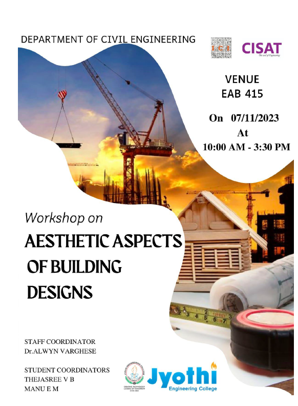 The workshop conducted on November 7, 2023, at Jyothi Engineering College aimed to provide students with an in-depth understanding of the aesthetic components integral to architectural design. Organized by the Department of Civil Engineering along with Indian Concrete Institute (ICI)in collaboration with CISAT Authorized CADD Training Centre, the event intended to bridge the gap between theoretical knowledge and practical application in the field of Civil Engineering.