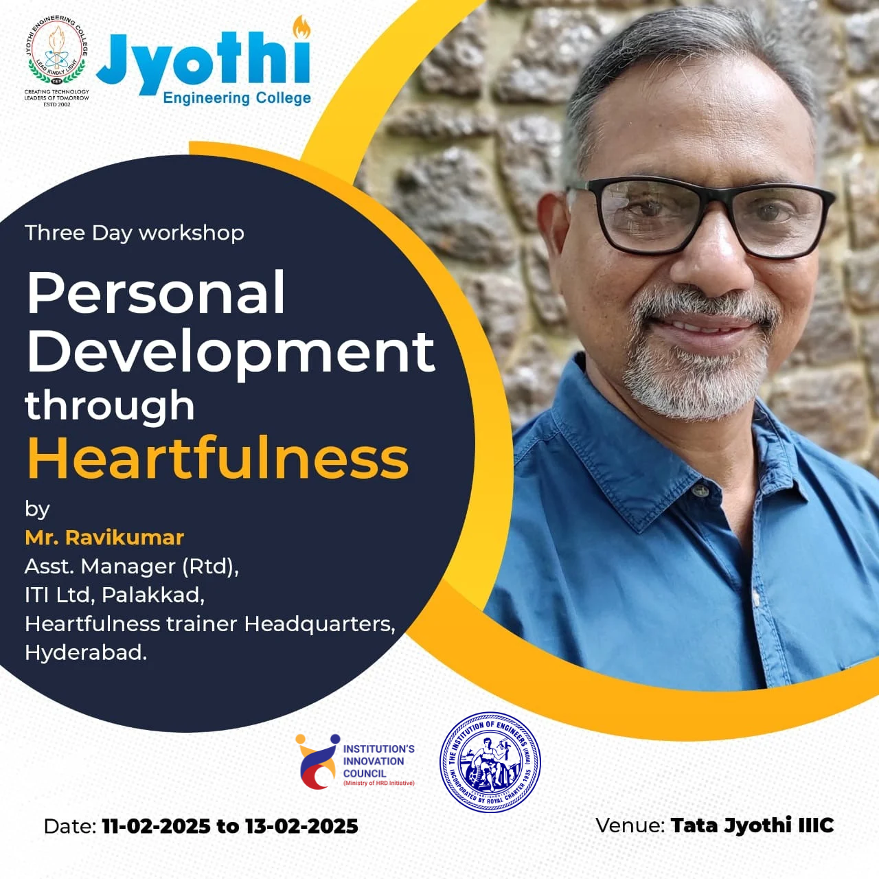 The IEI Students Chapter of the EEE Department at Jyothi Engineering College, in association with the Institution’s Innovation Council, successfully conducted a three-day workshop titled “Personal Development through Heartfulness” from 11th to 13th February 2025. This workshop was designed to help students cultivate inner balance, emotional resilience, and self-awareness through heartfulness practices. The sessions were led by Mr. Ravikumar, a certified Heartfulness Trainer from the Hyderabad Headquarters, who guided participants through various techniques of meditation, relaxation, and mindfulness. He emphasized the importance of self-discipline, stress management, and inner harmony in personal and professional life. The interactive nature of the workshop allowed students to engage in practical exercises, discussions, and guided meditation sessions, enabling them to experience the benefits of heartfulness firsthand. All members of the IEI Student Chapter, EEE Department actively participated in the event, making it a highly enriching and transformative experience. The workshop provided students with valuable tools to enhance their mental well-being, focus, and overall personal growth, fostering a positive and mindful approach to daily life.